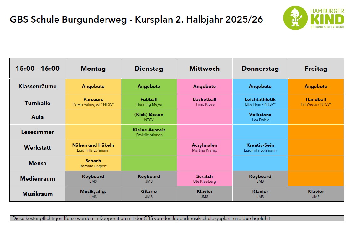 Zu Beginn eines Schuljahres werden in Nachmittagsggruppen alle Kurse vorgestellt und die Kinder können auf einem Wahlzettel ihre Favoriten ankreuzen und ihren Wahlzettel mit nach Hause nehmen. Die Eltern gleichen die Wünsche ab. Hierbei sind die vorgegebene Altersstufe, der geplante Wochentag und einige kursspezifische Kriterien zu beachten. Wichtig: Alle Kurse, die über die JMS angeboten werden, sind kostenpflichtig. Beiträge erfragen Sie bitte unter der Rufnummer 040/428 01 41 85.